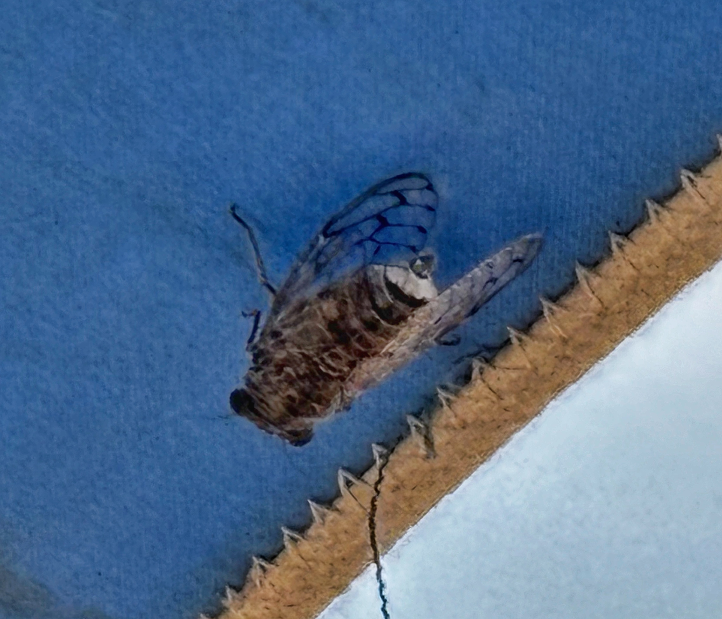 Och firad blev jag av honom hela dagen, förutom ett väldigt vackert halsband och örhängen i silver slapp jag som jag önskat kökstjänstgöring hela dagen. Det hade blivit lite svalare så vi gick ner till vårt vanliga lokus, Aloha, vid hamnen. Flera bord var lediga, sju med disk från tidigare besökare. Vi satte oss vid ett närmast havet och försökte utan framgång få killen som ”jobbade” där att uppmärksamma oss. Han kom med kaffe till någon två bord bort, och gick ut igen, fnissande och scrollande på sin mobil med en tom bricka under armen, förbi alla oavplockade bord. När han ställde sig i dörren och skrattande fortsatte surfa på sin leksak reste vi oss och gick till nästa servering, glassbaren intill. Där fick vi direkt service och när vi satt där och mumsade på var sin tostado med rökad lax och avokado och en stor caffe con leche började det plötsligt låta. Högt och nära. Som ett mellanting mellan en borrmaskin och en högspänningsledning som fått fnatt. Vi tittade oss omkring, men ingen annan verkade ha reagerat och ljudet kom onekligen från vårt bord. Då upptäckte Mannen den, en cikada som satt på insidan av vår parasoll och använde den som en resonanslåda.