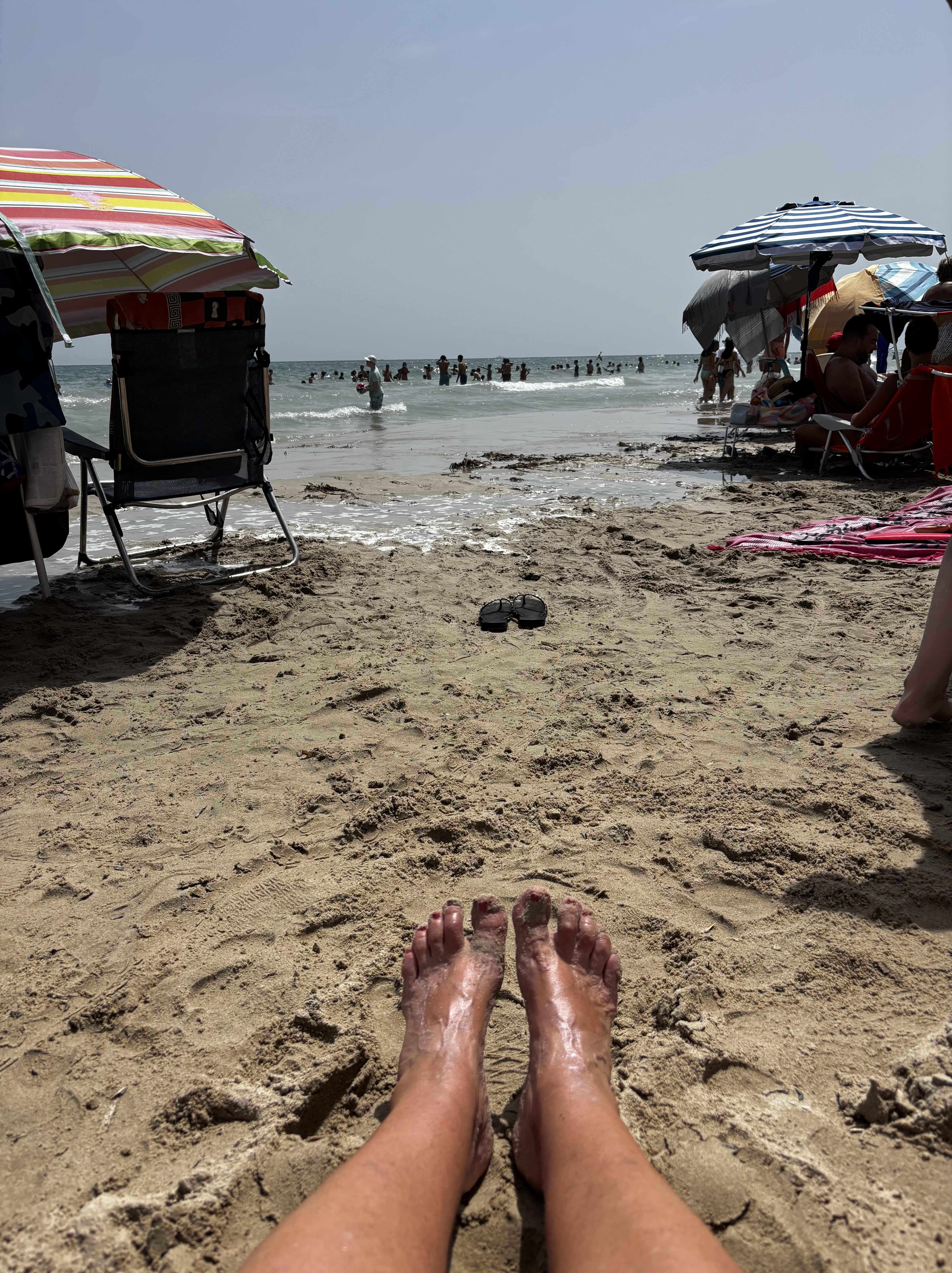 På stranden lyckades vi hitta en dryg kvadratmeter att resa parasollen och fälla upp solstolarna. Ljuvligt! Lätt lunch, bocadilla med tonfisk och tomat på Jesuitasbaren intill och ett stort glas Tinto de Verano till mig och en lika stor öl till Mannen.