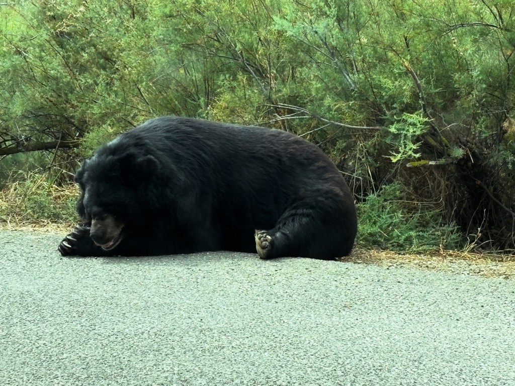 Vad jag däremot inte hade innan var levande björnar. Nu fick jag några bilder på nallar i dvala. En som låg uppe på en cementbyggnad och gäspade, en som sov på en ställning och den tredje nästan mitt på vägen. Det fanns stora skyltar att man inte fick köra närmre än fem meter från björnarna, men den här nuddade man nästan.