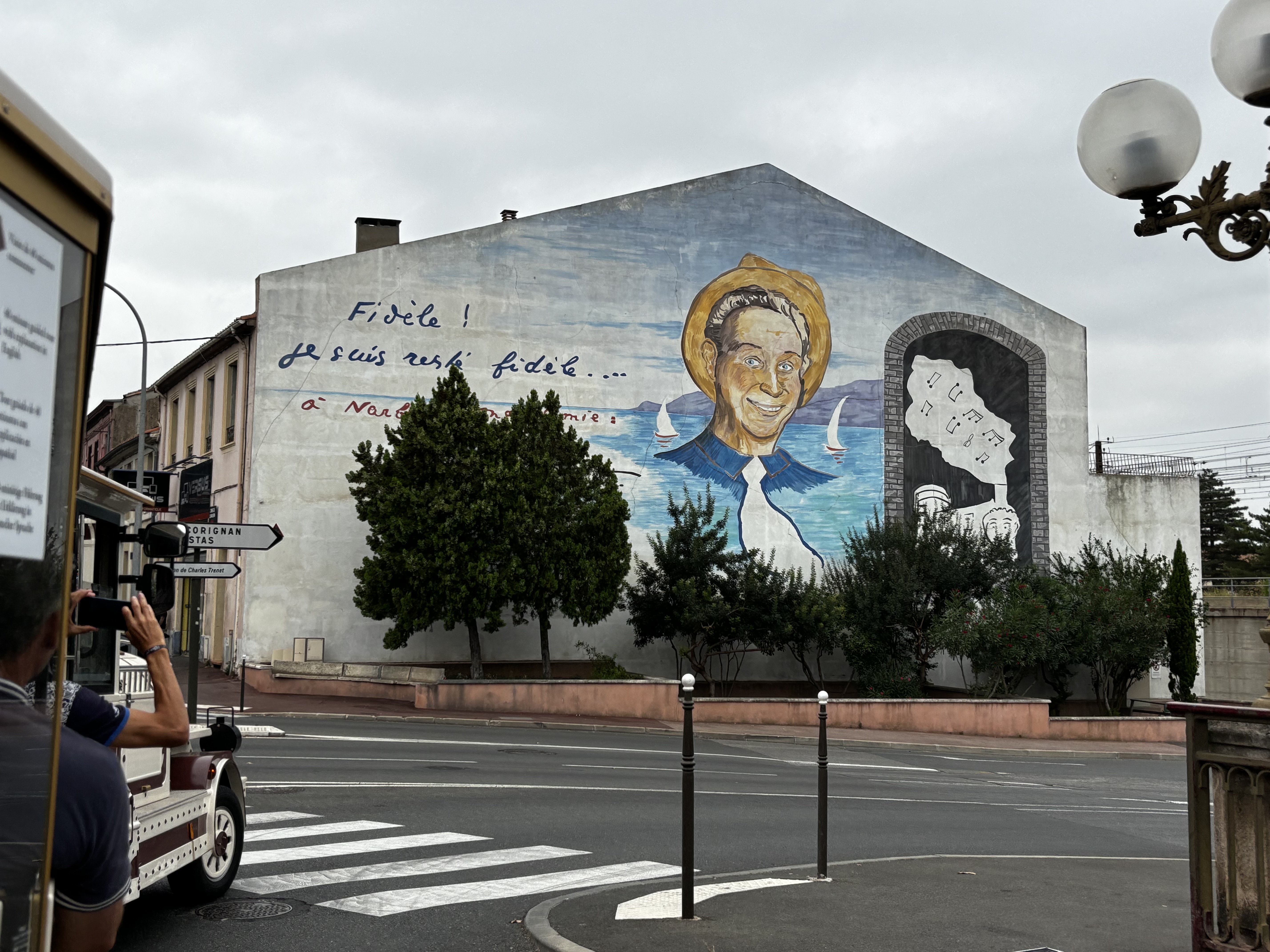 Fattade inte allt för mycket, men kanalen hade byggts på Medeltiden av handelsmän för att varor skulle kunna transporteras, och man var väldigt stolt över stadens son nummer ett, sångaren Charles Trenet (1913–2001), som är känd för sånger som ”La Mer” och som var en stor profil inom fransk chanson. Han spelades i tågets högtalare och fanns på flera skyltar och målningar.