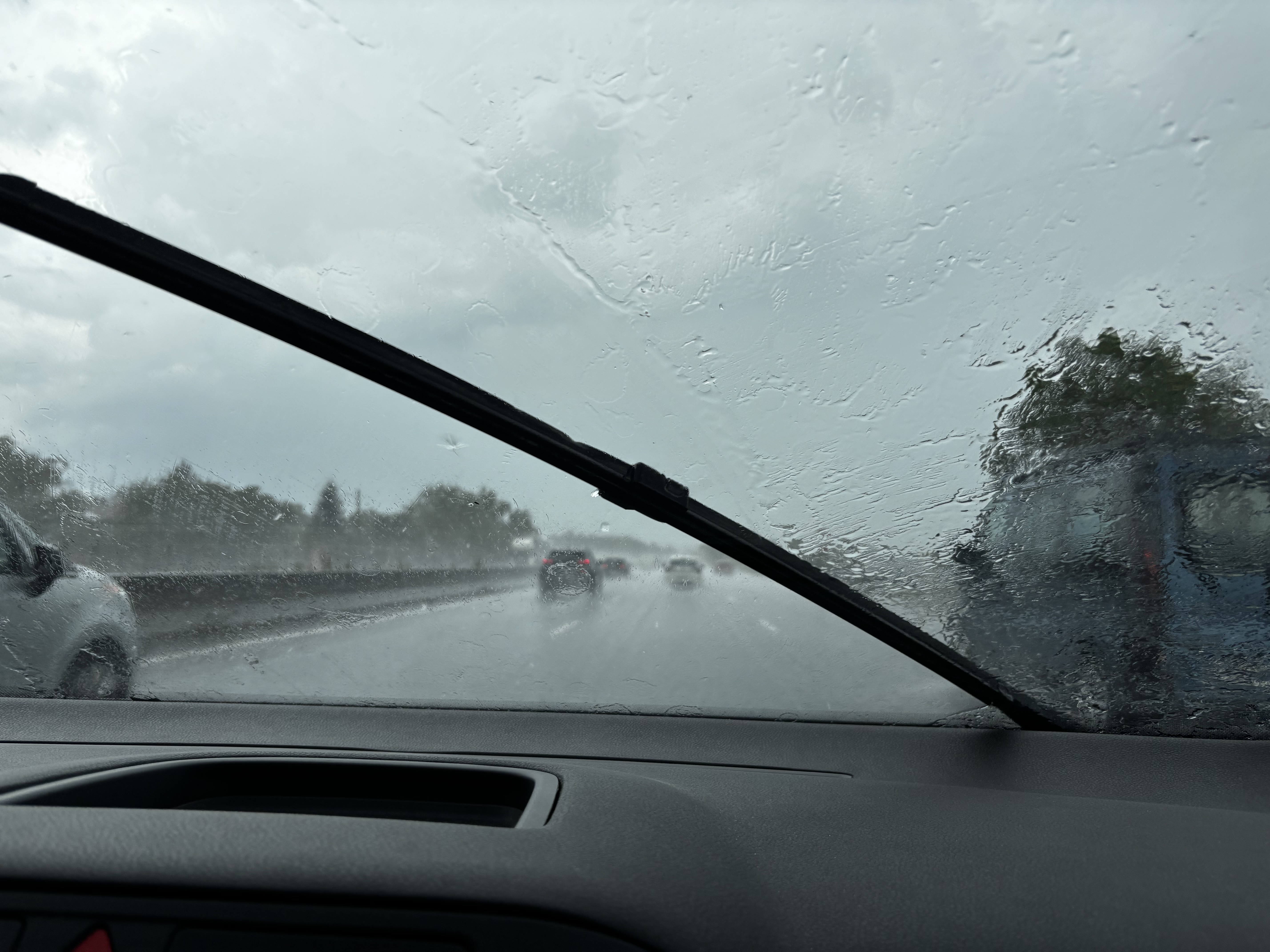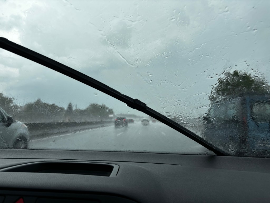 Efter röd varning för värme i Spanien fick vi nu orange varning för regn när vi körde norrut. Och regnade gjorde det! Trafiken kröp fram, långsammare än vindrutetorkarna pendlade.