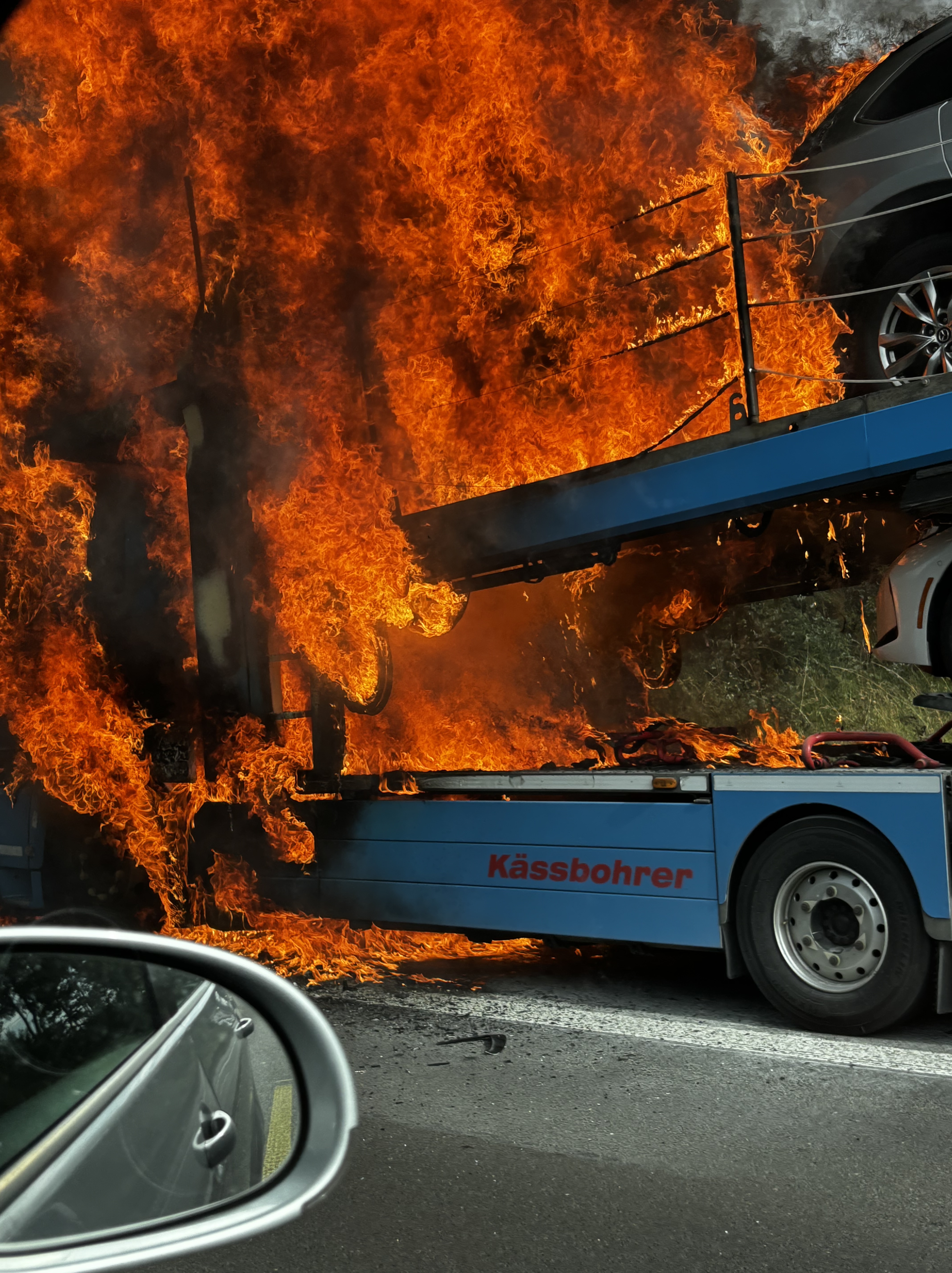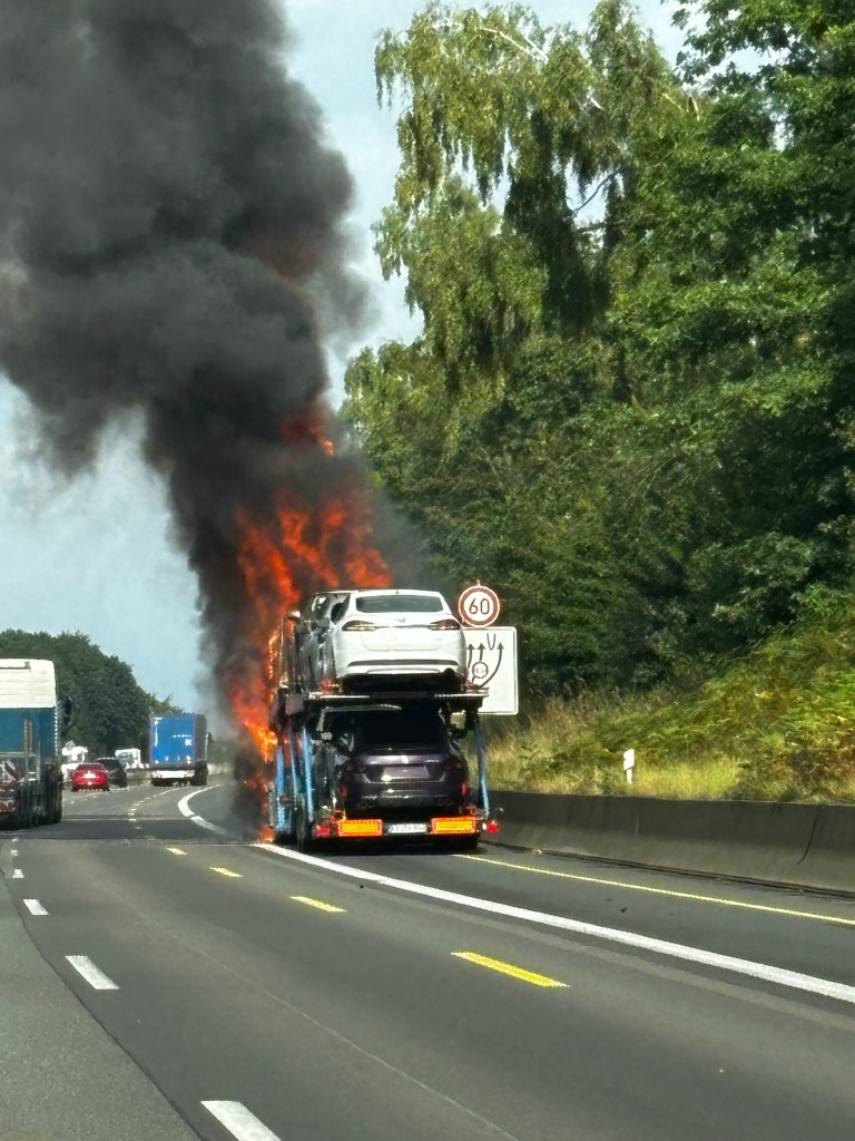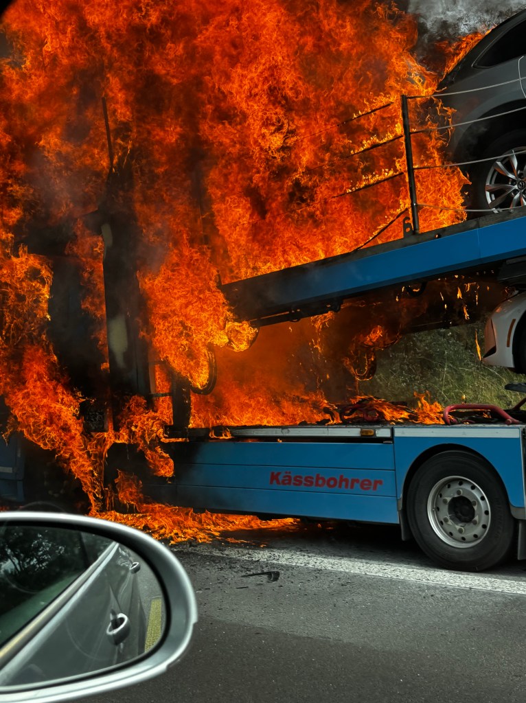 Efter ytterligare ösregn på natten fortsatte vi norrut på morgonen, och,planerade att hinna så långt norrut vi kunde i Tyskland att det skulle räcka med en övernattning till. Vi kom så långt som till en by som heter Heidersteg, men precis innan avfarten höll vi på att fastna bakom en brinnande biltransport. Förmodligen hade dragvagnens dieseltank exploderat och de två främsta bilarna på flaket brann också. Hettan när vi passerade var enorm och några minuter senare kom blåljusen och vägen stängdes.