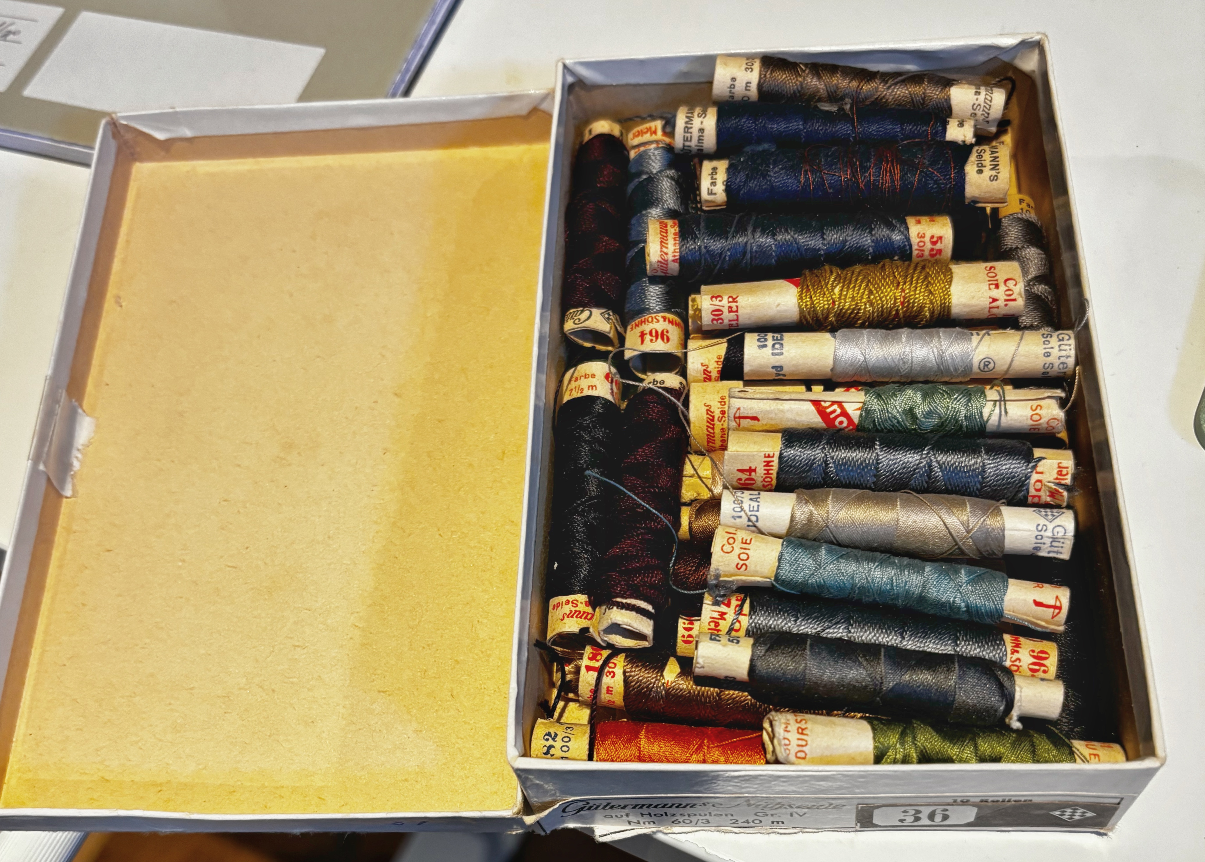 Något jag också hittade i lådan var en ask med tyskt sysilke, som jag fått efter svärmor, som hon i sin tur fått av någon gammal skräddare i släkten. Kanske något för Antikrundan?