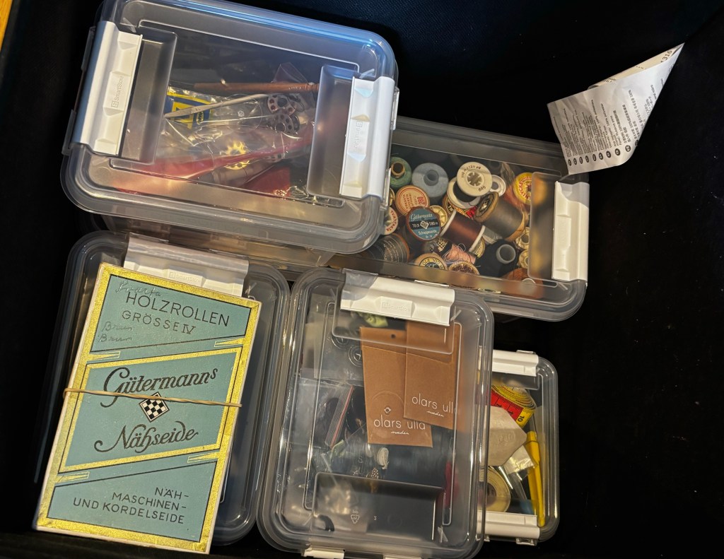 Däremot köpte jag förvaringsburkar med lock för att rensa sylådan. Alla dessa trådrullar som väckte minnen. Den där gröna var till råsidenet jag köpte i München, då när jag fick återvända till butiken på morgonen för de stängde kassan prick 18.00, mitt framför näsan på mig (Ordnung muss sein!) och hela resesällskapet fick vänta på mig..